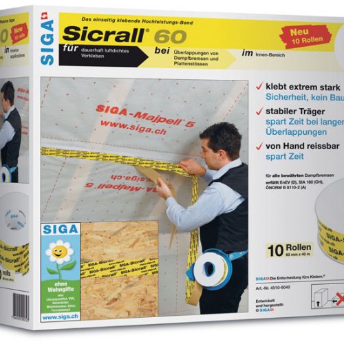 1. The SIGA Sicrall is an outstanding single-sided adhesive tape for airtight sealing of overlaps and joints. It applies smoothly, adheres strongly even on rough surfaces, and ensures long-term durability. A must-have product for achieving perfect airtightness in modern construction projects.