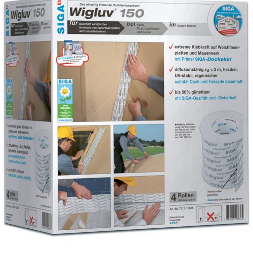 The single-sided high-performance adhesive tape, Wigluv 150 (6″), is perfectly suitable for permanent windtight sealing of roof and wall sheathing on the outside as well as WRB seams. This wide version of Wigluv is also ideal for flashing in rough openings for windows and doors. Combined with the high-performance primer Dockskin, can be a solution for woodfibre boards, masonry, and base joints.